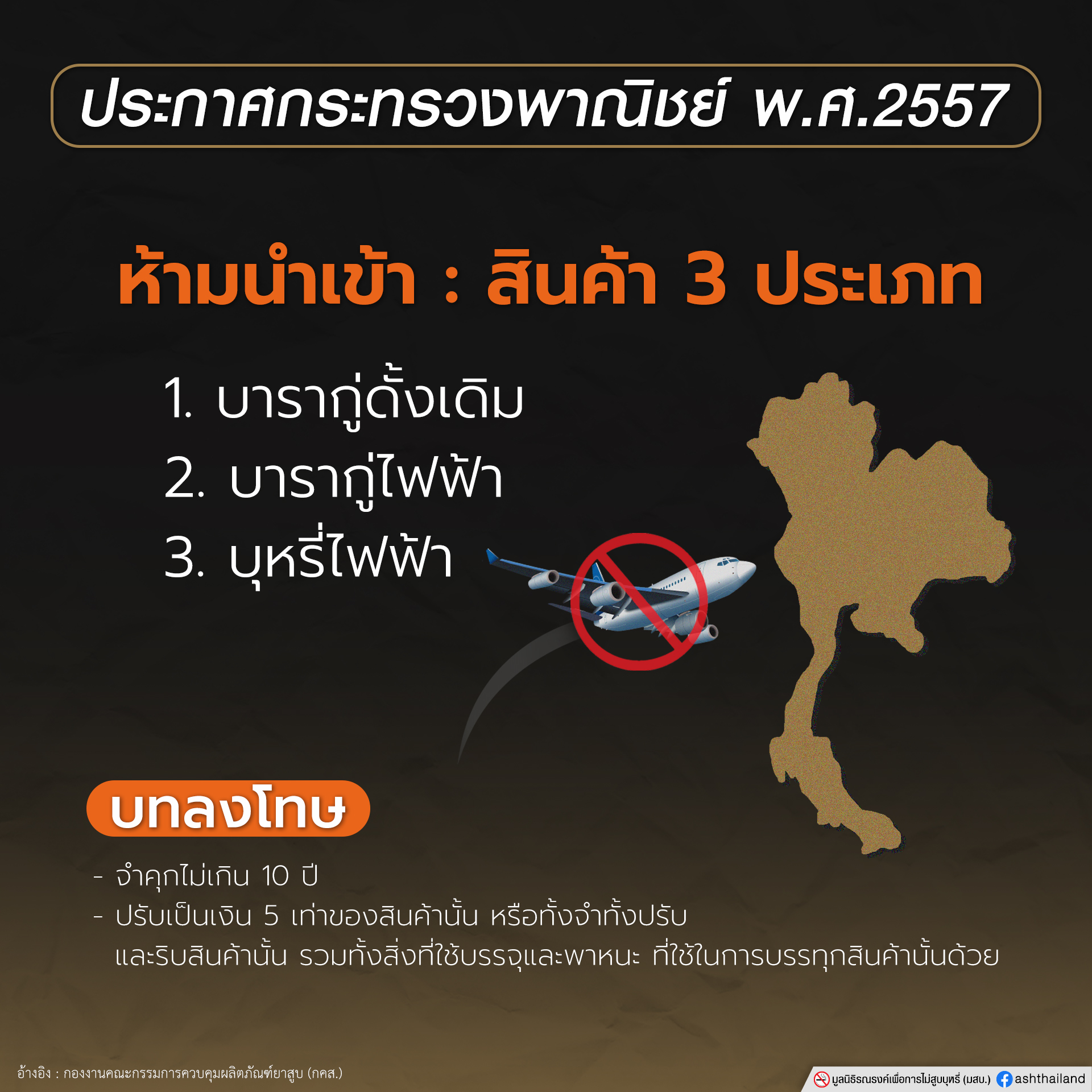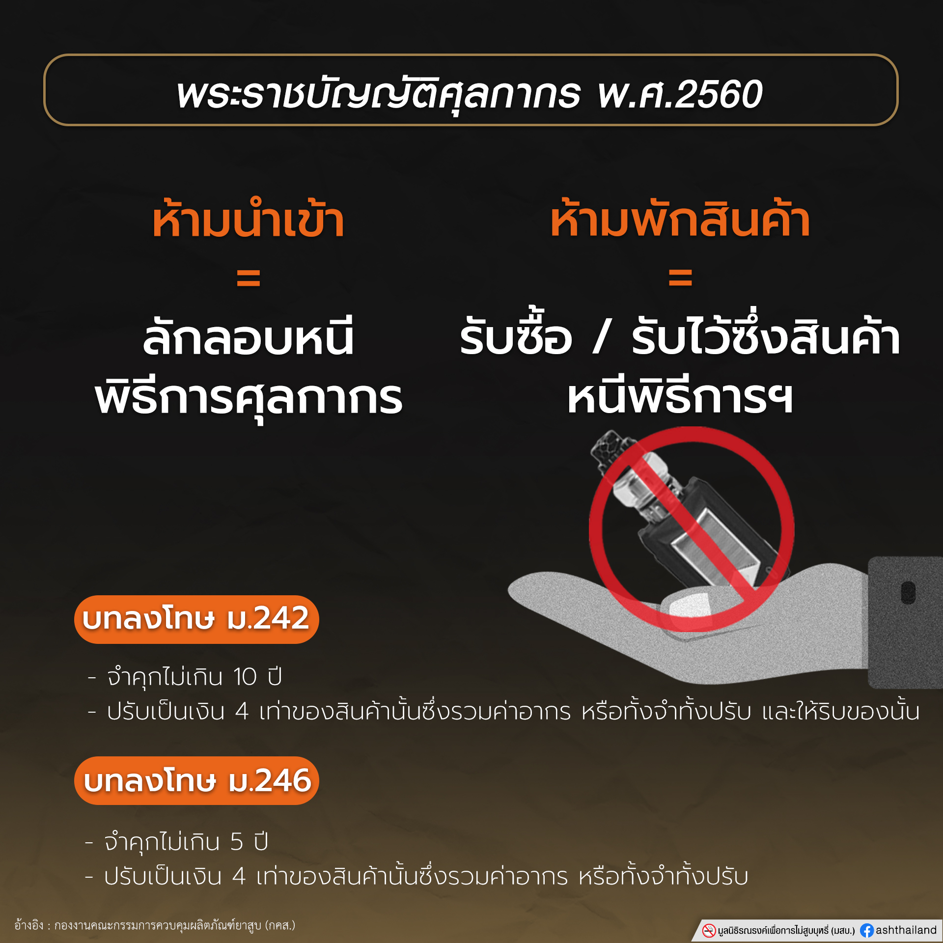 กฎหมายว่าด้วยการควบคุมบุหรี่ไฟฟ้า 1 กุมภาพันธ์ 2568 โดย Admin / ประชาสัมพันธ์ข้อมูลข่าวสาร,ข่าวฝากประชาสัมพันธ์,ประชาสัมพันธ์ข้อมูลข่าวสาร,ไม่มีหมวดหมู่ กฎหมายว่าด้วยการควบคุมบุหรี่ไฟฟ้า พ.ร.บ.ศุลกากร พ.ศ.2560 มาตรา 244 ที่บัญญัติว่า “ผู้ใดนำเข้าของที่ผ่านหรือกำลังผ่านพิธีการทางศุลกากรเข้าในราชอาณาจักร หรือส่งของดังกล่าวออกไปนอกราชอาณาจักร หรือนำของเข้าเพื่อการผ่านแดน หรือการถ่ายลำเลียงโดยหลีกเลี่ยงข้อจำกัด หรือข้อห้ามอันเกี่ยวกับของนั้น ซึ่งความผิดที่ผู้มีไว้ในครอบครองซึ่งของที่มิได้ผ่านพิธีการศุลกากรจะได้รับคือ ความผิดฐานสนับสนุนการกระทำความผิด พ.ร.บ.ศุลกากร พ.ศ. 2560 มาตรา 246 ใช้สำหรับกรณีของผู้ที่ ช่วยซ่อนเร้น ซื้อ รับไว้ หรือมีบุหรี่ไฟฟ้าไว้ใน ครอบครอง ทั้งที่รู้อยู่ว่าบุหรี่ไฟฟ้าเป็นของที่ห้ามนำเข้ามาประเทศไทย ต้องถือว่ามีความผิดเช่นกัน ซึ่งหากถูกจับกุมดำเนินคดีต้องได้รับโทษจำคุกไม่ เกิน 5 ปี หรือปรับไม่เกิน 500,000 บาท หรือทั้งจำ ทั้งปรับ ตามคำสั่งคณะกรรมการคุ้มครองผู้บริโภค ที่ 9/2558 กำหนดว่า บุหรี่ไฟฟ้ายังเป็นสินค้าที่ห้ามขายหรือให้บริการ ซึ่งกำหนดโทษสำหรับผู้ประกอบธุรกิจทั่วไป ให้จำคุกไม่เกิน 5 ปี ปรับไม่เกิน 500,000 บาท หรือทั้งจำทั้งปรับ และหากผู้ที่กระทำผิดเป็นผู้ประกอบธุรกิจในฐานะผู้ผลิต ผู้สั่ง หรือผู้ที่นำเข้ามาเพื่อขาย ต้องรับโทษเพิ่มสูงขึ้นเป็นจำคุกไม่เกิน 10 ปี ปรับไม่เกิน 1,000,000 บาท หรือทั้งจำทั้งปรับ กองงานคณะกรรมการควบคุมผลิตภัณฑ์ยาสูบอ้างอิงข้อมูลจาก กรมประชาสัมพันธ์