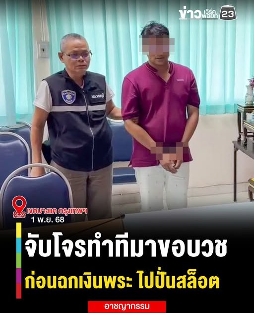(1 พ.ย.68) ผู้สื่อข่าวรายงานว่า ที่ สภ.ไทรน้อย จ.นนทบุรี พ.ต.อ.ณัฏฐ์เดชา ฐานิสภัทราพงศ์ ผกก.สภ.ไทรน้อย , พ.ต.ท.เรวัต สุริยะ สว.สส. พร้อมเจ้าหน้าที่ชุดสืบสวน ร่วมกันจับกุม นายชุติศรีณ์ หรือ เต้ย (สงวนนามสกุล) อายุ 39 ปี ได้ที่อะพาร์ตเมนต์ ย่านบางแค ตามหมายจับศาลจังหวัดนนทบุรี ที่ จ.1438/2568 ลงวันที่ 27 ต.ค.68 ในข้อหา “ลักทรัพย์ในเคหสถาน” หลังก่อเหตุลักเงินสด จำนวน 5,000 บาท ภายในกุฏิของ พระครูวินัยธรสมศักดิ์ หรือ พระอาจารย์โบว์ รองเจ้าอาวาสวัดไทรน้อย เหตุเกิด ช่วงค่ำ วันที่ 24 ส.ค.68.หลังเกิดเหตุ เจ้าหน้าที่ตำรวจตรวจสอบภาพจากกล้องวงจรปิด พบชายต้องสงสัยสวมแว่นตา นั่งรถแท็กซี่มาจอดบริเวณหน้ากุฏิรองเจ้าอาวาส ก่อนจะเดินทำทีมาหาพระรองเจ้าอาวาส จากนั้น นั่งรออยู่ในห้อง ก่อนเปิดกระเป๋าบนโต๊ะหยิบเงินสดใส่กระเป๋ากางเกงด้านขวา แล้วลุกขึ้นมาพูดคุยกับพระอาจารย์โบว์ ประมาณ 2 นาที ก่อนเดินออกจากกุฏิไปอย่างใจเย็น แล้วขึ้นรถแท็กซี่หลบหนี .ต่อมา เมื่อวันที่ 31 ต.ค.68 เวลา 17.00 น. เจ้าหน้าที่ตำรวจ สภ.ไทรน้อย ร่วมกับ สน.ท่าข้าม และ สน.หลักสอง เข้าตรวจสอบที่อะพาร์ตเมนต์ดังกล่าว แขวงบางแคเหนือ เขตบางแค กรุงเทพฯ และสามารถจับกุมตัวนายชุติศรีณ์ได้.จากการสอบสวน นายชุติศรีณ์ ให้การรับสารภาพว่า วันเกิดเหตุได้นั่งรถแท็กซี่จากบ้านย่านเพชรเกษม 32 มาที่วัดไทรน้อย เนื่องจาก พ่อแม่เคยมาทำบุญที่วัดนี้ เห็นว่ามีผู้คนมาทำบุญเยอะและพระใจดี จึงเกิดความคิดอยากจะก่อเหตุ โดยทำทีจะมาขอเงินบวชจากเจ้าอาวาส แต่เมื่อเห็นเงินในกระเป๋าสตางค์วางอยู่บนโต๊ะจำนวน 5,000 บาท จึงฉวยโอกาสหยิบมาใส่กระเป๋ากางเกง แล้วรีบเดินออกจากกุฏิขึ้นแท็กซี่ที่จอดรออยู่หน้าวัดกลับบ้านทันที หลังจากได้เงินมา ผู้ต้องหาได้นำไปเล่นการพนันออนไลน์ “ปั่นสล็อต” จนหมด พร้อมยอมรับว่า เคยติดคุกมาแล้ว 1 ปี 6 เดือน และยังกล่าวขอโทษพระอาจารย์โบว์ พร้อมยืนยันว่า จะไม่ก่อเหตุอีก โดยให้เหตุผลว่า ฝั่งธนบุรีไปก่อเหตุไม่ได้แล้ว เพราะมีคนจองกฐินไว้เยอะ.พ.ต.อ.ณัฏฐ์เดชา ผกก.สภ.ไทรน้อย เปิดเผยว่า จากการสืบสวนพบว่า นายชุติศรีณ์ มีพฤติกรรมก่อเหตุลักทรัพย์และฉ้อโกง มาแล้วหลายครั้งในหลายพื้นที่ โดยเฉพาะเขตกรุงเทพฯ และปริมณฑล และมีหมายจับรวมทั้งสิ้น 9 คดี ได้แก่ 1. ปี 2561 สน.หลักสอง ข้อหา “ตัวการในคดีฉ้อโกง” 2. ปี 2561 สน.หลักสอง ข้อหา “ฉ้อโกงโดยแสดงตนเป็นคนอื่น” (2 คดี) 3. ปี 2561 สน.หนองค้างพลู ข้อหา “ตัวการในการฉ้อโกง” 4. ปี 2561 สน.บางบอน ข้อหา “ฉ้อโกงโดยแสดงตนเป็นคนอื่น” 5. ปี 2561 สภ.สามพราน จ.นครปฐม ข้อหา “พยายามฉ้อโกงโดยแสดงตนเป็นคนอื่น