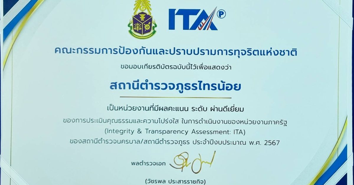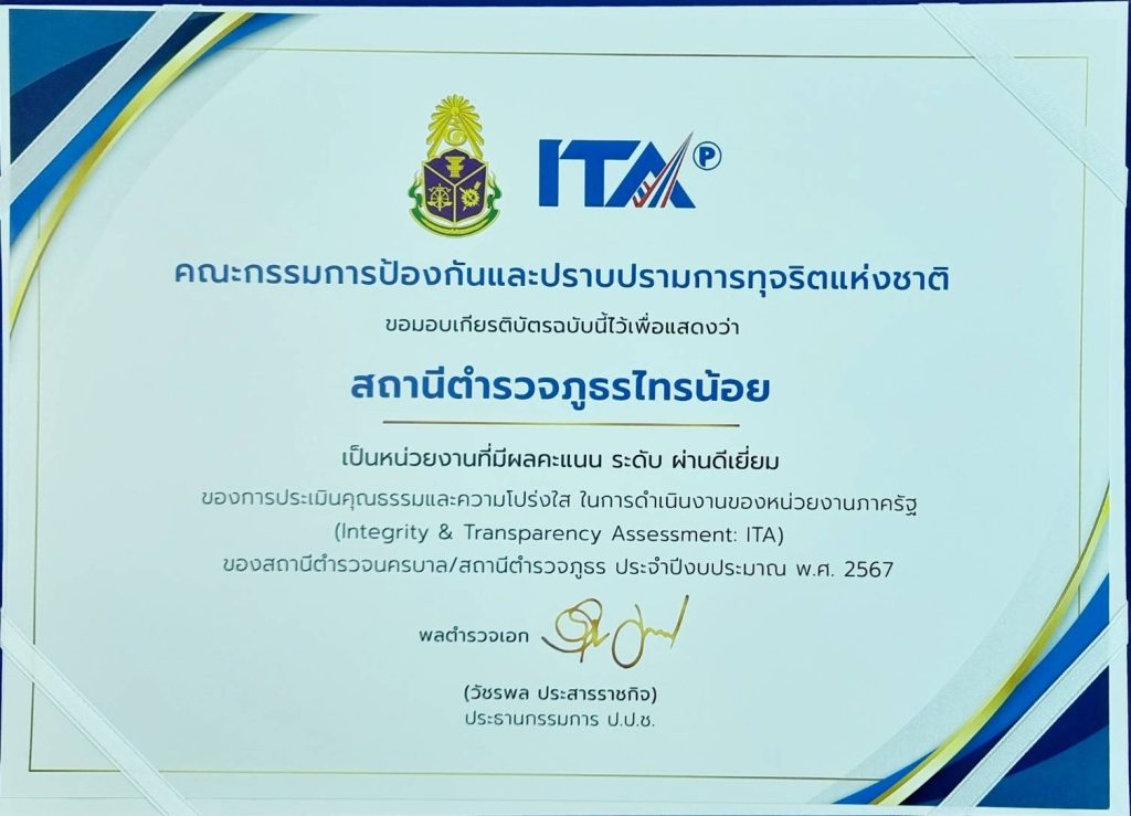 สถานีตำรวจภูธรไทรน้อย ได้รับเกียรติบัตรจาก ป.ป.ช.